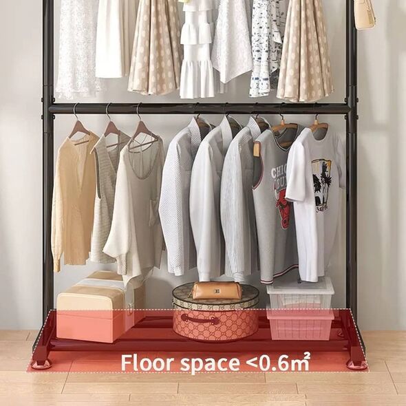 تصميم عملي: تم تصميم هذا الرف الذكي لتنظيم الملابس الزائدة وتلبية الاحتياجات اليومية، مما يساعدك على التخلص من الفوضى في الغرفة. يحتوي الرف في الجزء السفلي على حامل أحذية متين يمكن استخدامه لتخزين الأحذية أو صناديق الأحذية، مما يوفر مساحة تخزين إضافية ويزيد من ثبات الرف.
